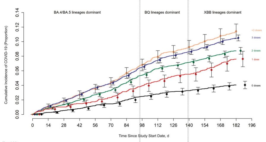 Figure 6. Cumulative incidence of COVID-19 disease for study participants stratified by the number of COVID-19 vaccine doses previously received [source: Taken and modified from Shrestha et al., Open Forum Infectious Diseases, 2023].
