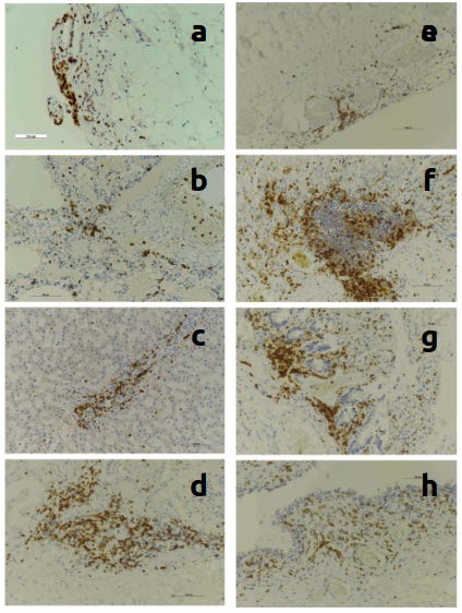 That paper, which has been immediately marked as disinformation by the propaganda machinery, proved to have captured the point precisely. However, the indiscriminate vaccination campaigns continued unperturbed, leading to several adverse reactions among vaccine recipients due to the off-target distribution of the vaccine-derived genetic material [11]. The tragic case of a 14-years-old Japanese girl, who died of multi-organ inflammation two days after receiving the third dose of the Pfizer/BioNTech vaccine, resembles these dramatic adverse effects [12]. The histopathological data show infiltration of inflammatory lymphocytes in the heart, the lung, the liver, the kidney, the diaphragm, the stomach, the duodenum, and the bladder (Figure 3).