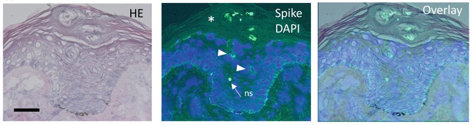 Figure 5. (left) Histopathology of a papular vesicle on the hand; (center) detection of the SARS-CoV-2 spike protein using an anti-S1 subunit antibody; (right panel) overlay image (scale bar: 50 μm). The spike protein is present in the cornified layer (asterisk) and intraepidermally (arrows) [source: Taken and modified from Sano et al., The Journal of Dermatology, 2024]. Note that no staining for the SARS-CoV-2 nucleocapsid protein was observed, proving that the spike protein is vaccine-derived (data not shown).