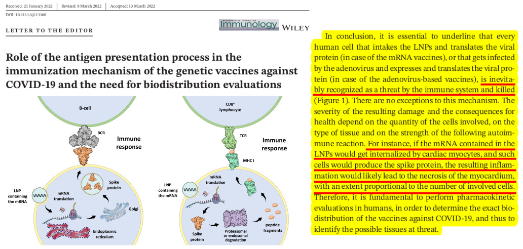 Three years ago I have tried to warn the scientific community about the risks of the distribution of the genetic vaccines beyond the injection site (Figure 2), hypothesizing for the first time the autoimmune inflammatory mechanism which is responsible for the vaccine-induced myocarditis [10].